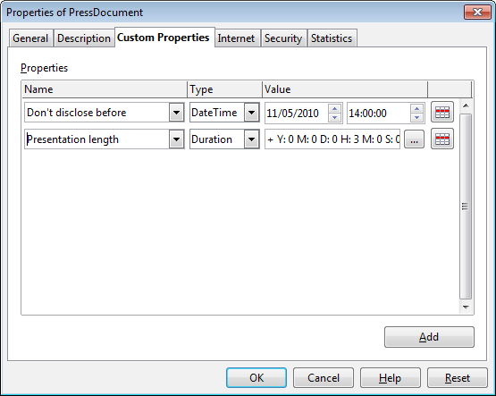 properties as name/value pairs in the File > Properties dialog.